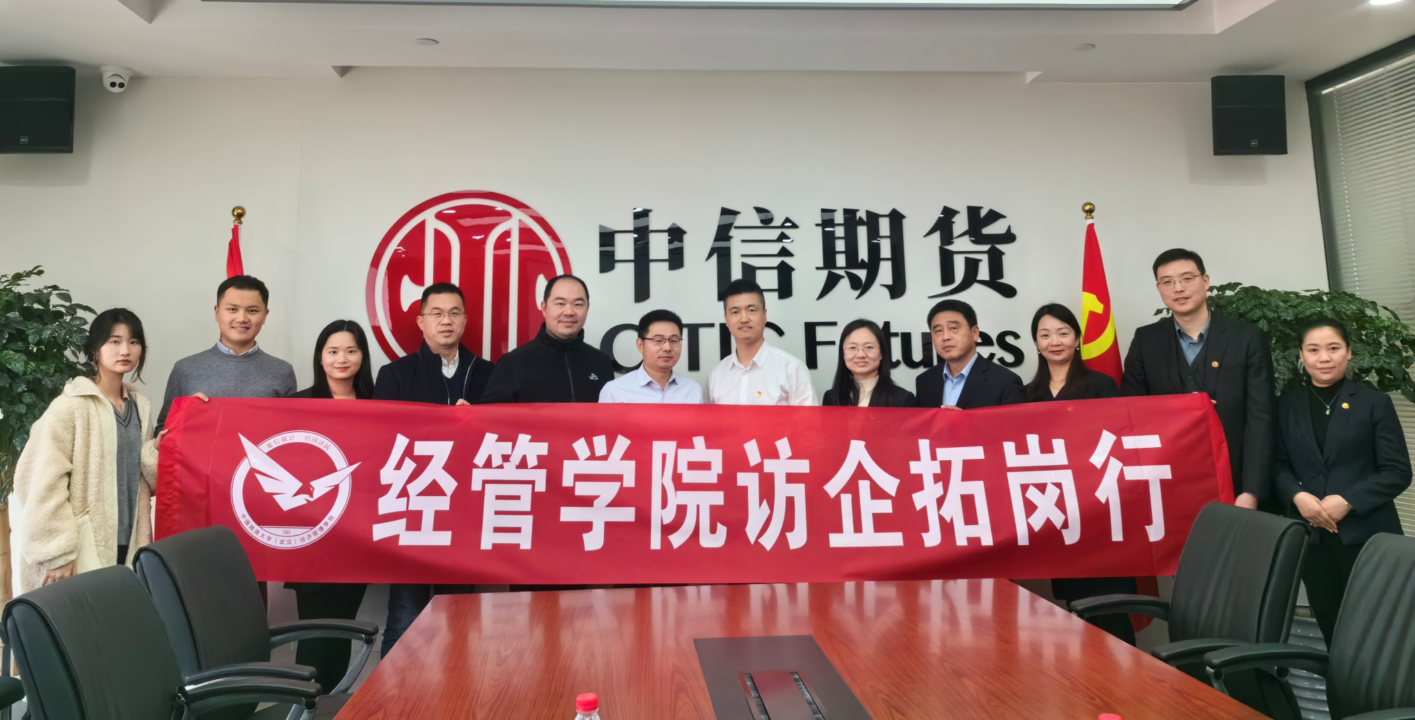 (通讯员 张弛 程茹)2024年1月10日上午,我院赴中信期货有限公司中南分公司开展校企合作座谈会。院长於世为带队,院党委副书记李纪亮、大数据科学与应用统计系教工党支部书记王德运、辅导员张弛等人一同访企。中信期货中南分公司党支部书记及总经理苏仲博、副总经理兼产业客户部总监冯宇、运营管理部总经理刘骁、营销管理部总经理刘金红、渠道客户部总经理黄永凯、财富客户部总经理王勇以及党支部组织委员方赢出席会议。