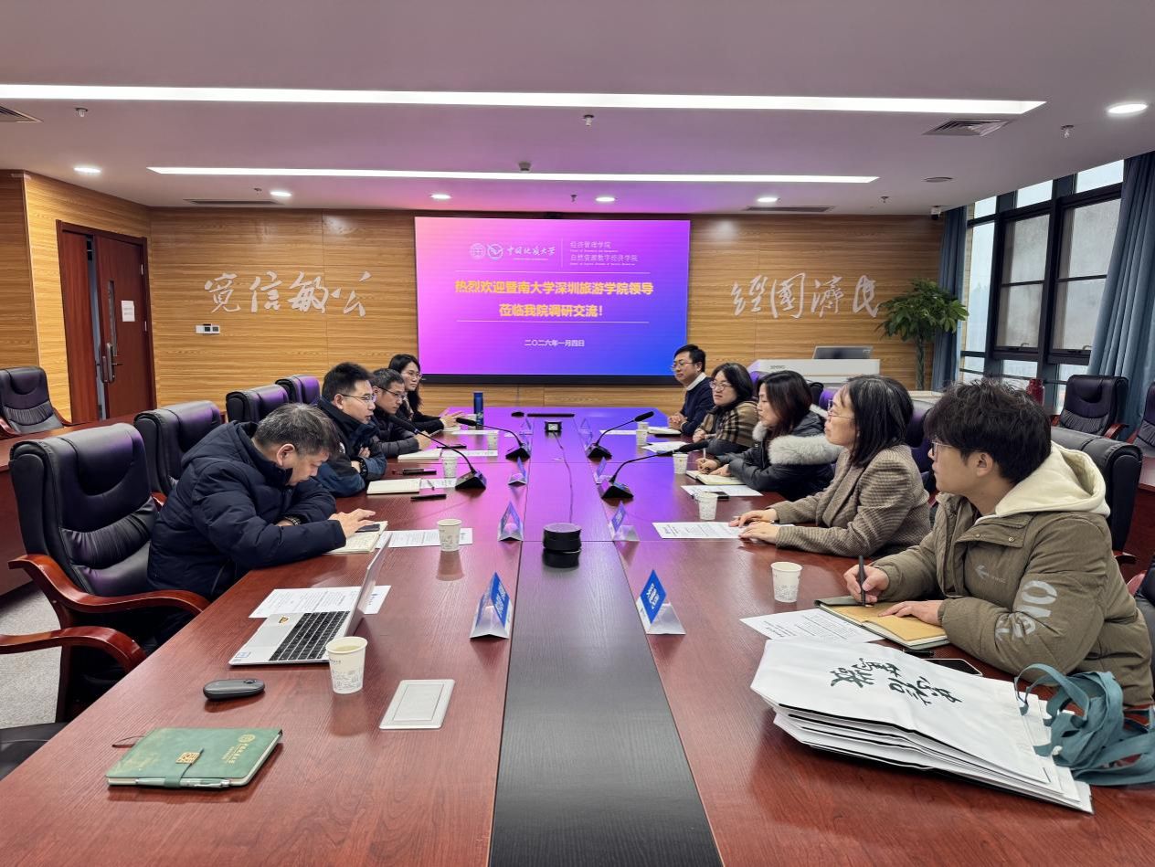 (通讯员:努尔夏提·居勒提 李琳)1月4日下午,暨南大学深圳旅游学院院长文吉教授一行来访我院调研交流。院长於世为教授主持座谈,双方围绕数字经济背景下的学科建设、人才培养及合作办学等议题展开深入探讨。