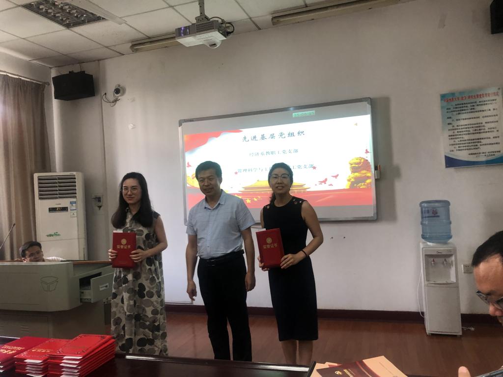 院长杨树旺宣读《中共韦德博彩-韦德博彩官网 委员会关于表彰2018-2019年度学院先进基层党组织、优秀共产党员、优秀党务工作者和师德师风道德模范的决定》。经济系教职工党支部、管理科学与工程系教职工党支部获评学院先进基层党组织;肖建忠、王广民、 李江敏、王然、龚承柱、田昆同志获评学院优秀共产党员;齐睿、孙涵、梁玥琳获评学院优秀党务工作者;朱冬元、 江毅、吴磊、余敬、屈文彬、徐德义、梁玥琳、隆雁翔同志获评学院师德师风道德模范。院党委书记杨昌锐为获得学院奖励的集体和个人颁奖。
