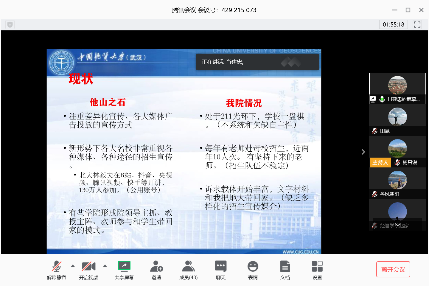 院长杨树旺肯定了与会老师的发言。他提出,招生和就业都是关乎人才培养质量的重要环节。新高考的变化使得招生工作从学校层面直接下沉到各专业,影响到了专业发展,要顺应潮流,充分利用线上方式和新媒体工具做好宣传工作。针对疫情对学院的就业工作的影响,杨院长要求各系提高政治站位,学工组提供具体指导,系主任、班主任、导师齐抓共管,用好校友在内的各项资源,全力做好就业工作。要求班子成员对口联系各系,督促工作落实招生和就业工作。