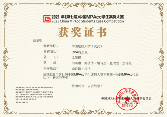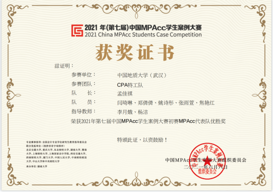 (通讯员:孟佳祺)6月6日,第七届全国MPAcc案例大赛落下帷幕。本次大赛分东北、华北、华东、华南、华中、西北、西南七大赛区,共2882个MPAcc学员团队授权参赛。在此次比赛中,我校MPAcc团队在竞争激烈的华中赛区取得了较好成绩。其中,以李月娥教授、杨洁教授为指导老师,孟佳祺同学为组长的“CPA特工队”在大赛第一阶段取得华中赛区第6名成绩,荣获华中赛区三等奖;大赛第二阶段取得了第27名的成绩,荣获全国优胜奖。