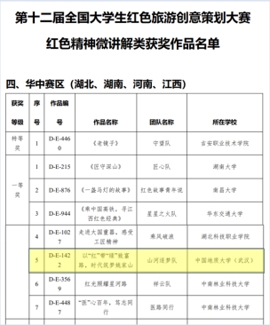 2022年6月30日,在中国共产党成立101年纪念日前夕,第十二届全国大学生红色旅游创意策划大赛初赛结果公布,伟德国际官网 李会琴老师指导的“山河逐梦队”(学生成员:刘婉婷、赵芳琪、龙心滢、吴胜珍、加里)荣获“红色精神微讲解”类华中赛区一等奖。这是我院连续两年在该项大赛中获奖,作品质量和奖项等级都实现了新的突破。