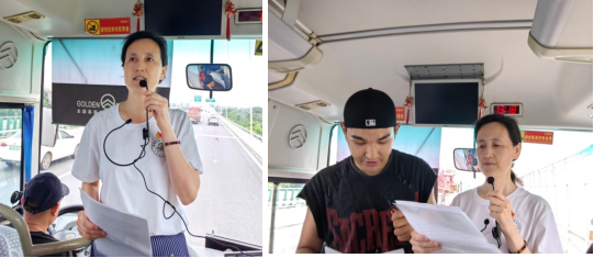 返程车上,梁玥琳老师从记录片《话说长江》说起,并邀请西尔艾力·买买提同学一同诗朗诵《新话说长江》,将师生们再次带回生态美丽、产业兴旺、文化昌盛的长江文明之河。师生共同倡议和约定,以长江母亲河儿女的身份,一起唱响新时代的《长江之歌》!