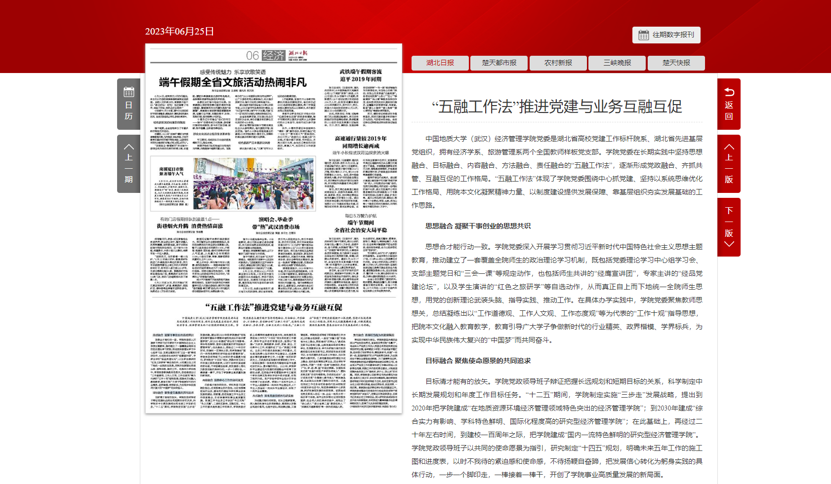 韦德博彩-韦德博彩官网 党委是湖北省高校党建工作标杆院系、湖北省先进基层党组织,拥有经济学系、旅游管理系两个全国教师样板党支部。学院党委在长期实践中坚持思想融合、目标融合、内容融合、方法融合、责任融合的“五融工作法”,逐渐形成党政融合、齐抓共管、互融互促的工作格局。“五融工作法”体现了学院党委围绕中心抓党建、坚持以系统思维优化工作格局、用院本文化凝聚精神力量、以制度建设提供发展保障、靠基层组织夯实发展基础的工作思路。