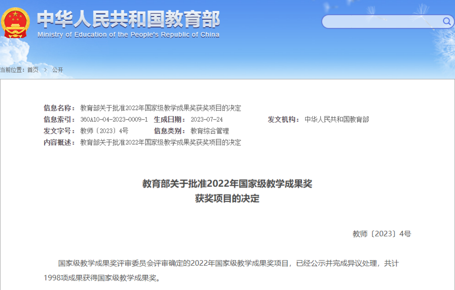 7月24日,《教育部关于批准2022年国家级教学成果奖获奖项目的决定》(教师〔2023〕4号)公布,我校作为第二完成单位,学院李江敏教授作为第三完成人参与完成的《以文化遗产教育培育大学生文化自信的路径研究与实践》,喜获高等教育(本科)国家级教学成果奖二等奖。