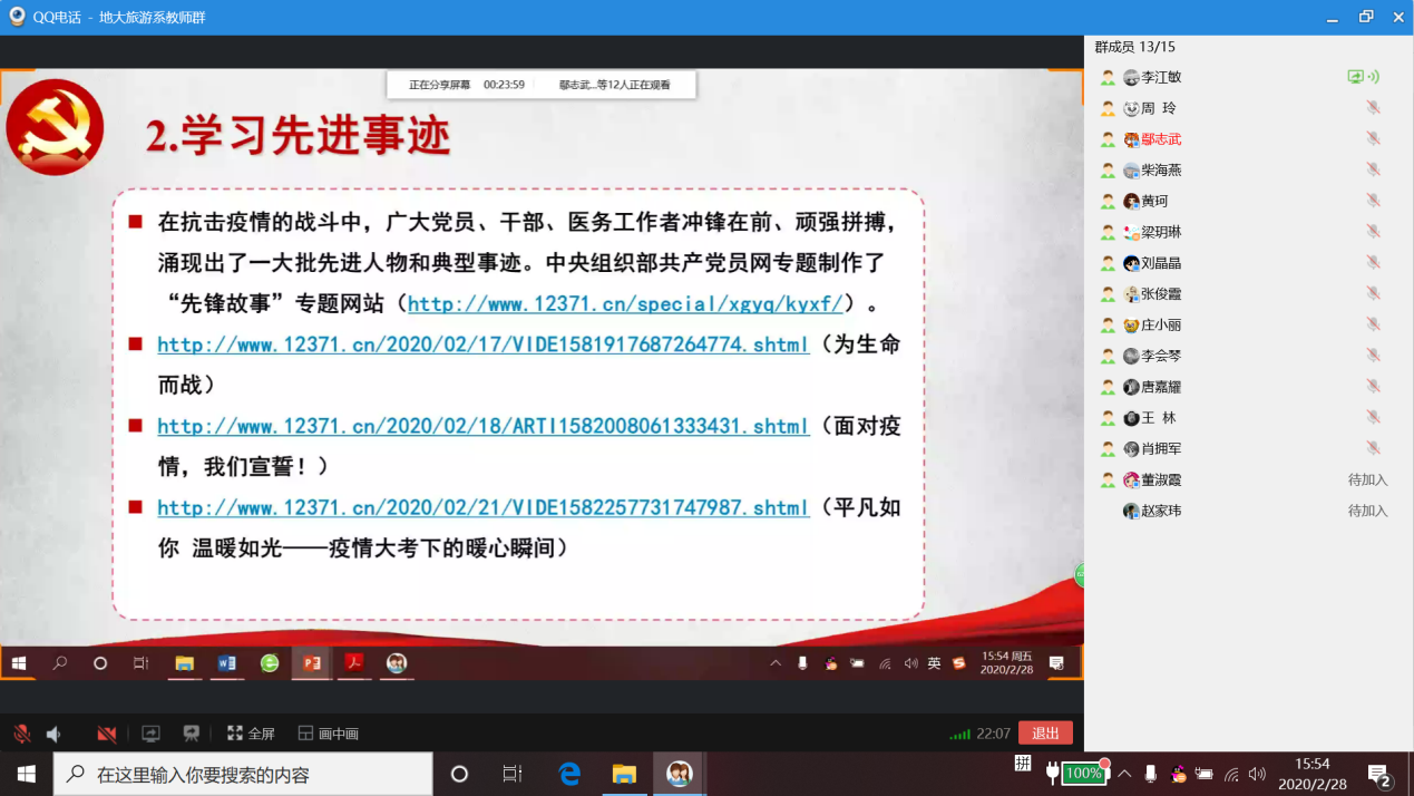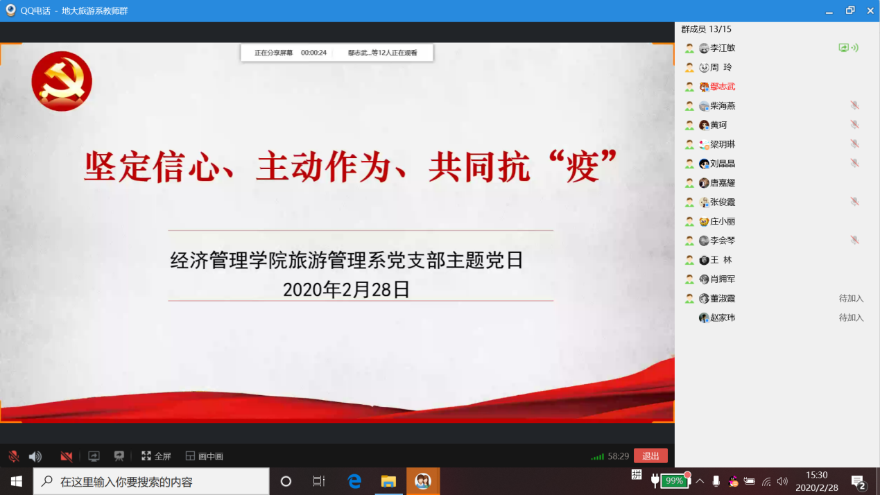 2020年2月28日下午,旅游管理系党支部以QQ电话会议的形式开展了以抗疫为主题的支部主题党日活动,旅游管理系党支部全体党员线上参加此次活动,支部外派挂职党员和群众教师线上列席此次活动。