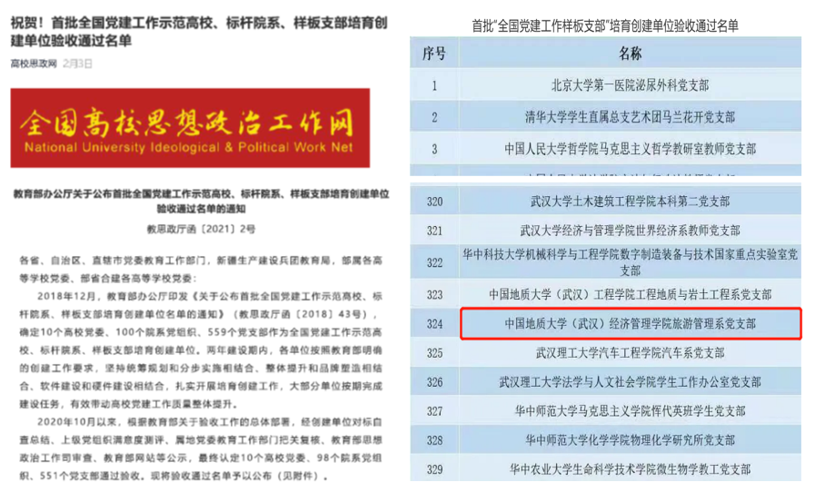 2021年2月3日,教育部发文公布首批全国党建工作培育创建单位验收通过名单,其中,全国党建工作示范高校党委10个、标杆院系党组织98个、样板党支部551个。韦德博彩-韦德博彩官网 旅游管理系党支部名列验收通过的“全国党建工作样板支部”名单之列,标志着历经两年的培育创建工作取得阶段性成果,迈向支部党建的新征程。