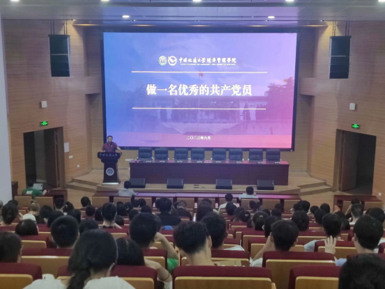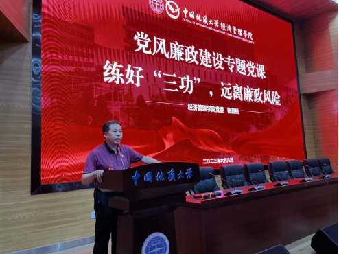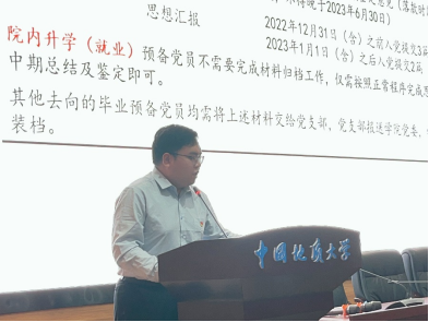 最后,蔡杨讲授院本文化及感恩诚信教育。蔡杨以征信知识为引,教育全体毕业生党员要以诚信为魂,廉洁为根,并深刻阐述了校训精神和学院文化,愿我院毕业生党员牢记教诲,终身不褪“地大经管色”,成长为德智体美劳全面发展的社会主义事业建设者和接班人!