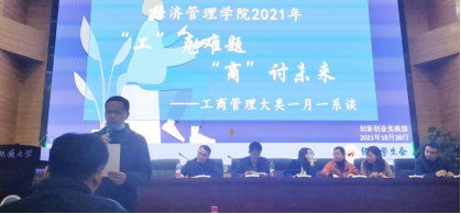 工商管理大类一月一系谈活动在经管楼二楼报告厅成功举办。活动得到各系高度重视和关注,工商管理系、会计系、旅游管理系主任及相关老师们现场出席为同学们答疑解惑,同时还邀请了学院合作单位广州中博教育股份有限公司和华中科技大学优秀学生与同学们展开交流。工商管理大类2020级全体同学线下参加,2021级全体同学通过腾讯会议线上参加活动。学生会创新创业实践部将前期联系各班级征集的学生问题、意见,及时反馈给各系老师,承办有序、互动积极。