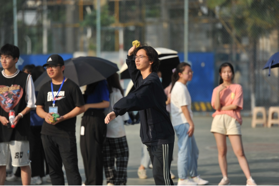 第四项:蒙眼互打。这个项目人气爆棚,活动现场瞬间成了武林高手过招现场,听声辩位,左突右刺,围观的同学们不时爆发出一阵阵笑声。