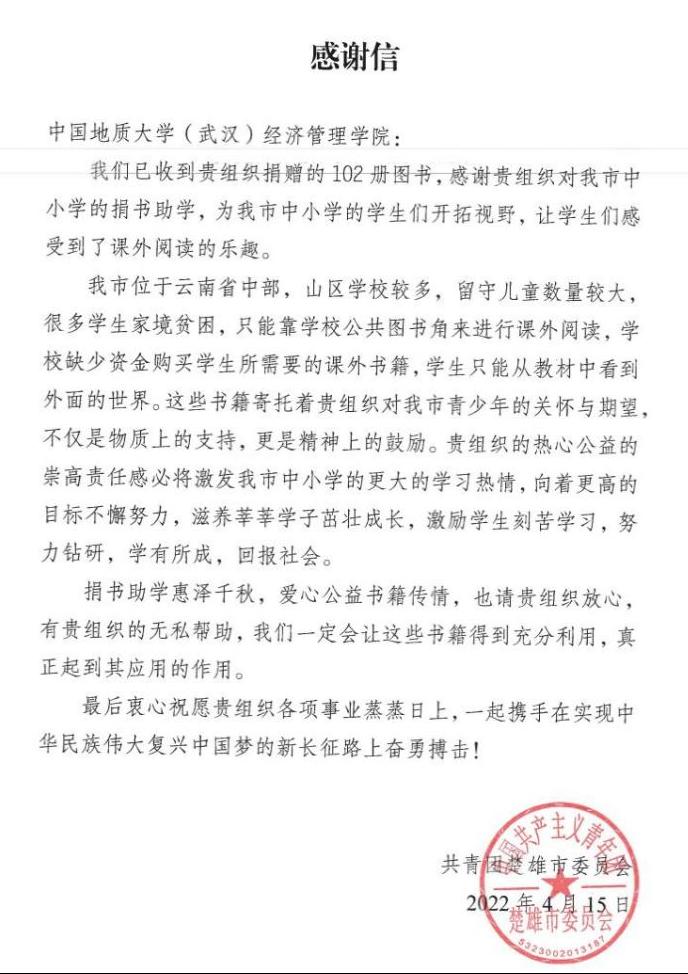 在一年的支教生活中,张康同学始终不忘自己是一名地大经管人,生活中发扬“艰苦朴素,求真务实”的校训精神,牢记“宽信敏公,经国济民”的院训精神,做到把地大精神带到服务地,讲好地大故事。积极配合研支团完成把地大特色活动开展到龙江的任务;利用班会时间给学生们播放地大相关宣传视频,讲述个人求学的故事,播撒希望种子。在五四青年节前夕,他带着支教团同学联系母校,发起向云南省楚雄市山村中小学校捐赠书籍的公益活动。本次捐赠活动得到了母校多个学院的大力支持,共筹集到书籍600余册,其中伟德国际官网 捐赠图书102册,涵盖文学、科普、经济、教育等多个领域。共青团楚雄市委员会对支教团及地大学生捐赠之举表示衷心的感谢,并向我院发来感谢信。