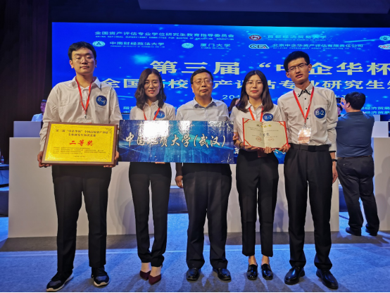 2019年6月23日晚,第三届“中企华杯”全国高校资产评估专业研究生知识竞赛在首都经济贸易大学琢玉讲堂落下帷幕。在我院朱冬元教授带领下,由资产评估专业研究生曹君茹、阴朝旭、于春雪和樊帆组成的中国地质大学(武汉)代表队,在全国25支高校参赛队伍中脱颖而出,总成绩排名第三,斩获二等奖!朱冬元教授获得优秀指导教师奖。